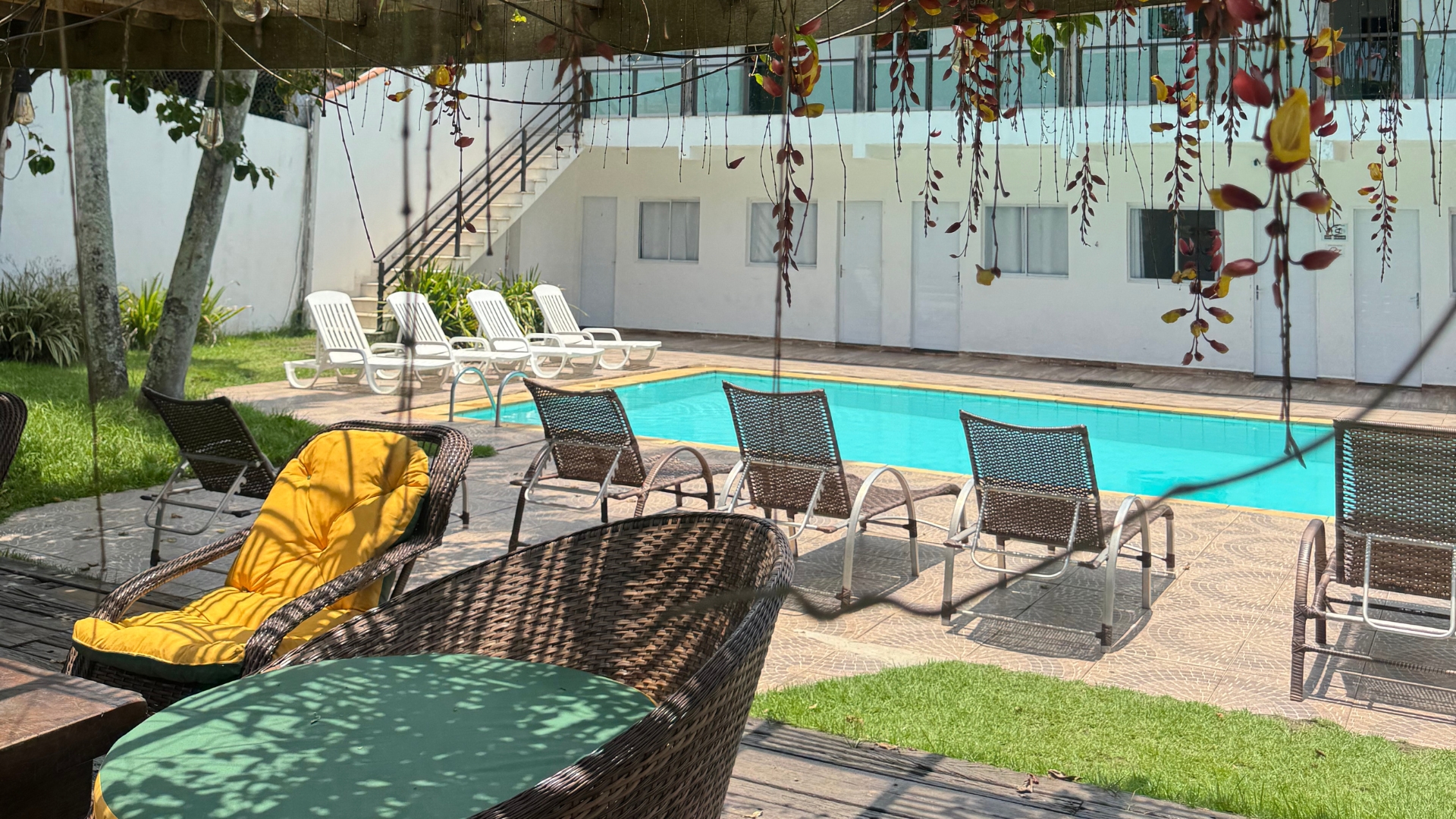 Para quem busca relaxar com comodidades extras, como jacuzzi e espaços de convivência, a dica é a Pousada Point Beach Jambolões. Além da piscina central rodeada por pergolados, o espaço conta com jardins, redário, fire pit e salão de jogos, tornando-se ideal para casais, famílias ou grupos que querem unir descanso e diversão em um só lugar.